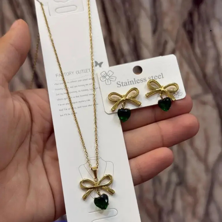 Bring a touch of charm and elegance to your style with the Emerald Bow Charm Set. Featuring delicate bow motifs adorned with vibrant emerald accents, this tarnish-free set enhances your fashion with a playful yet sophisticated vibe. Perfect for daily wear or festive occasions, it adds a pop of color and timeless beauty to any outfit.