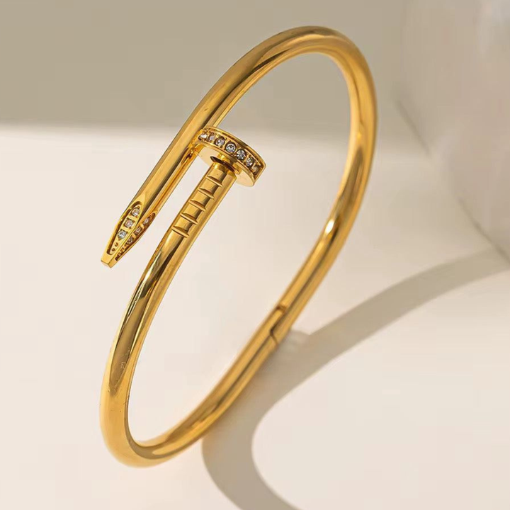 The front-facing head and tail of the "nail" are artistically curved, giving the bracelet a minimalist yet impactful visual. Enhanced with tiny embedded cubic zirconia crystals, the head of the bracelet sparkles just enough to balance elegance with confidence.