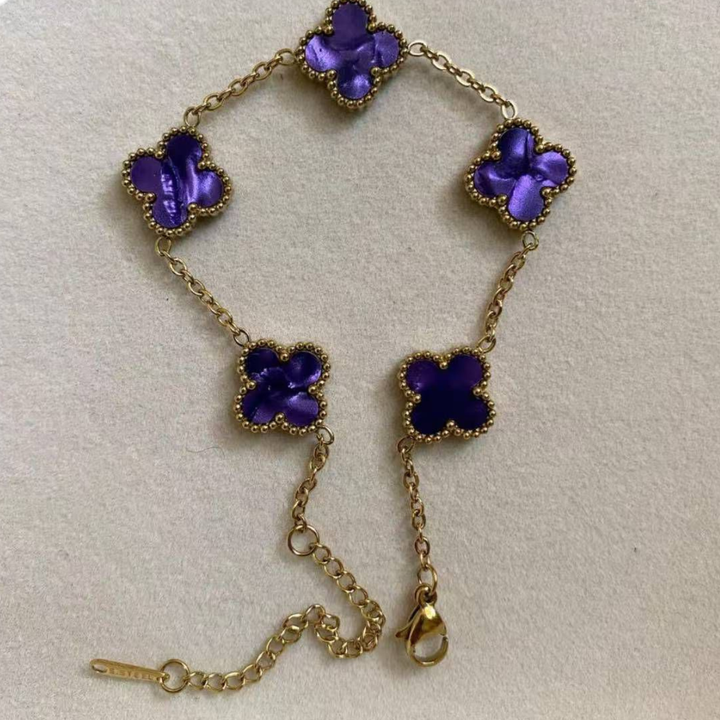 The Royal Violet Clover Bracelet is a tribute to refined beauty and timeless elegance. Each charm is fashioned in a distinctive four-leaf clover shape, symbolizing luck and love — beautifully finished with a bold yet classy deep violet enamel, surrounded by delicate beaded gold borders.