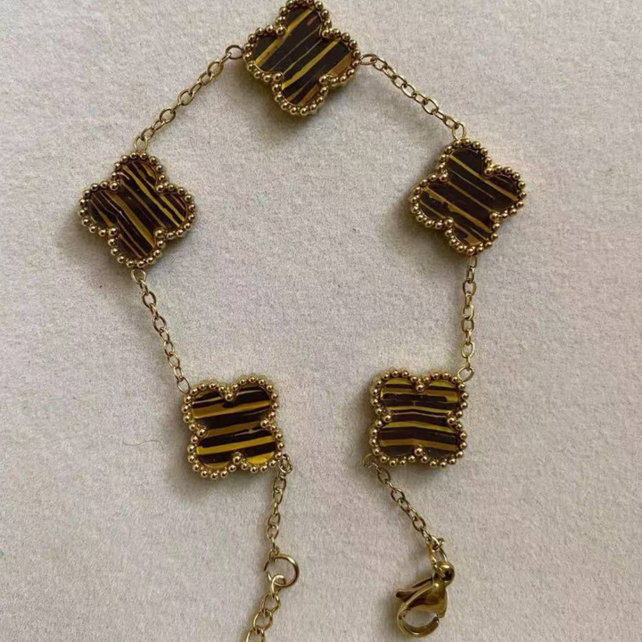 This designer-inspired piece features five signature four-leaf clover charms, each adorned with tiger-stripe patterned enamel — encased in a beautiful beaded gold frame. Every charm is connected through a soft, high-polish gold chain, ensuring a graceful fall on the wrist. Perfect for classy events, modern outfits, or layering with other gold accessories.